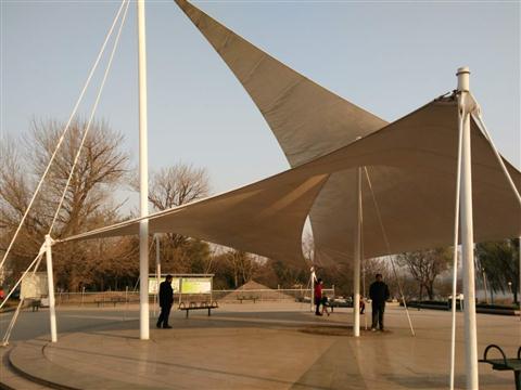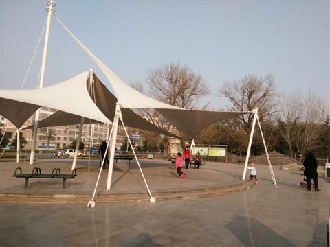 广场标志性建筑是自由几何凉亭、石书。