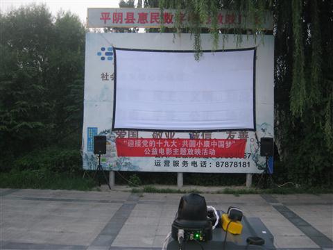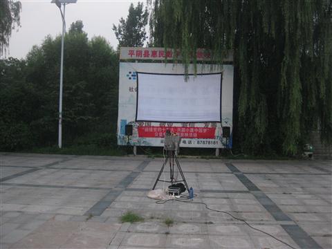 固定银幕架位于广场的北边,有三根碗口粗的钢管支撑,用三角铁焊接的框架,外面用1MM的铁皮,整个银幕架高5.5米,宽5.2米。
