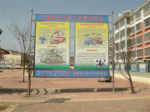 银幕架上方为“交通安全电影文化宣传园地”字样;下方为公益宣传栏,可张贴公益宣传海报或者喷绘;在宣传栏下方,有电影预告栏,用于预告电影节目,公示监督电话等。