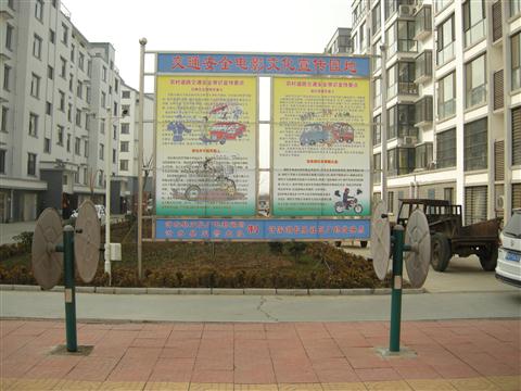 银幕架上方为“交通安全电影文化宣传园地”字样;下方为公益宣传栏,可张贴公益宣传海报或者喷绘;在宣传栏下方,有电影预告栏,用于预告电影节目,公示监督电话等。