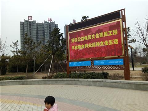 广场(社区)银幕架位于广场的东侧,其材质为木质结构,长5.5米,宽5 米 银幕架上写有公益放映字样,标明银幕架的用途;接下来为led电子屏,主要用来预告电影信息,并可用于公益宣传。电子屏下方为公益宣传栏,可张贴公益宣传海报或者喷绘;在宣传兰下方,有电影预告栏,用于预告电影节目,公示监督电话等。 固定银幕架在放映时为电影银幕架,在非放映时间,可作为户外宣传阵地使用