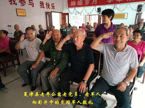 8月1日上午,夏津县老年公寓放映现场气氛热闹,掌声不断,现场正在放映《胜利大阅兵》。参加过抗美援朝战争的李富武、韩长林、肖长河、刘大才老人坐在前排,聚精会神地观看。当看到检阅方阵的官兵向习主席敬礼时,他们都举起右手朝银幕敬礼。在现场观影的其他老人也都被画面中庄严威武的阅兵方阵深深感染,纷纷鼓起掌来。
