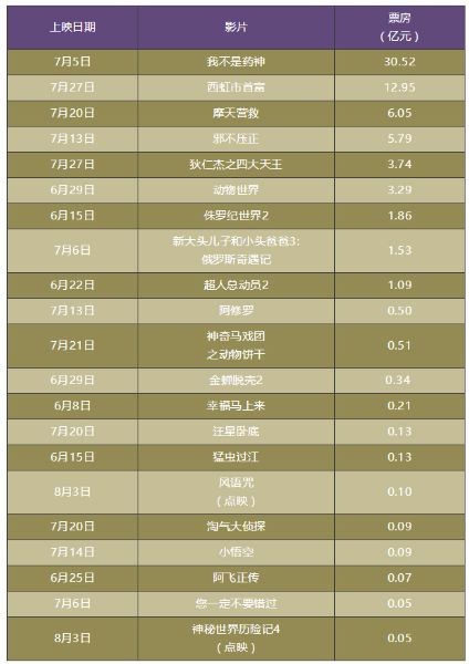 7月中国电影主流院线市场共上映影片30部,是2015年以来上映影片数量最低,更少的影片取得了更多的票房,从侧面体现出中国电影创作者对观众群体的变化及其对内容需求的要求有了更深入的了解。