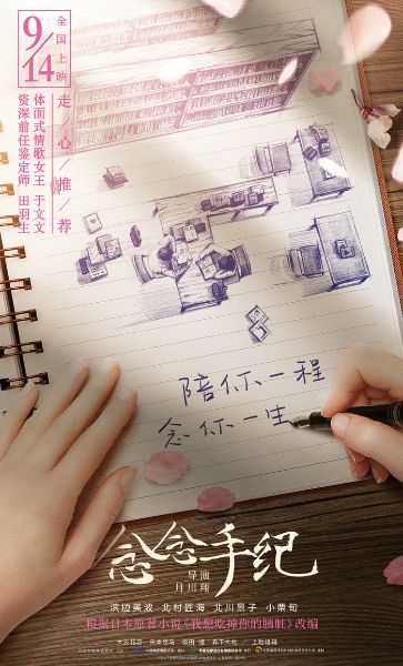 本次发布的中国版“手纪”海报,运用了极具青春漫画的风格,将学生时代青涩又美好的时光展现得淋漓尽致。这款海报中,经典的图书馆场景呈现在展开的笔记本上,樱花洒落的画面更是烘托出甜蜜的气氛。笔记本上“陪你一程,念你一生”的文字,包含了志贺春树对山内樱良所有的情感。