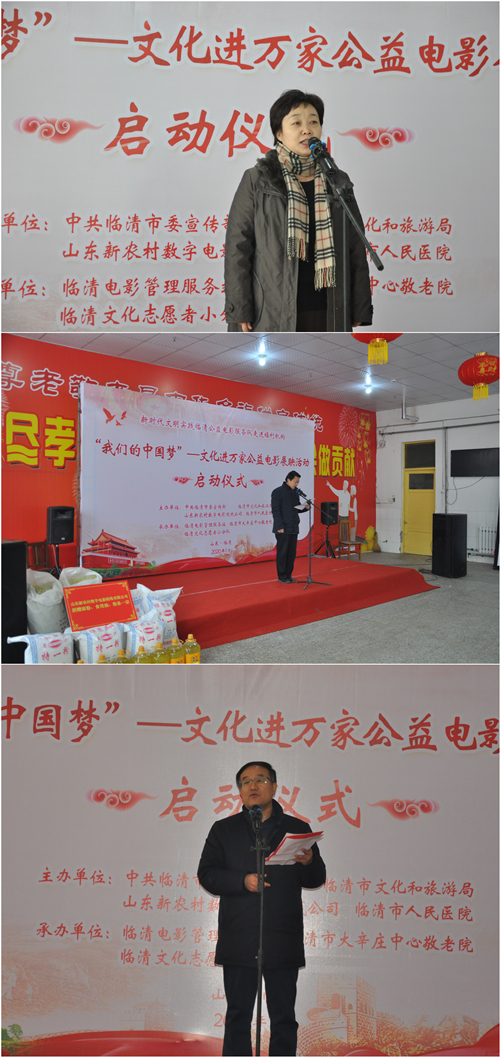 2020年1月22日,在新春佳节来临之际,为丰富临清市福利机构老人精神文化生活,传播敬老爱老正能量,推进新时代文明实践志愿服务走进福利机构,由临清市委宣传部、临清市文旅局、山东新农村数字电影院线有限公司联合主办,临清电影管理服务站承办的“我们的中国梦”——文化进万家公益电影展映活动在大辛庄中心敬老院圆满启动。