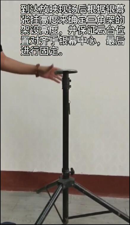 三角架可自由调节高度。放映员到达放映现场后,根据银幕张挂高度来确定三脚架的架设高度,并保证云台位置对齐银幕中心的山东标准化放映规范。