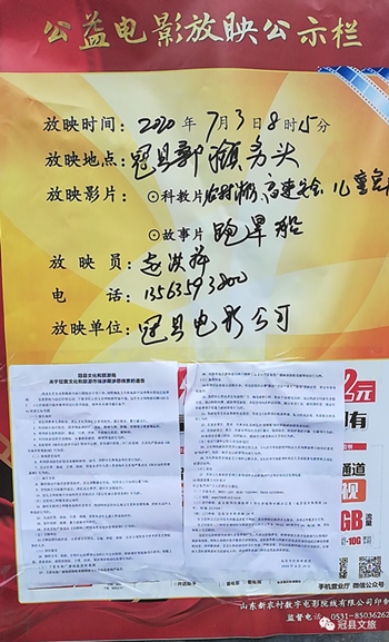 今年扫黑除恶专项斗争工作启动以来,冠县电影公司便积极组织开展扫黑除恶专项斗争相关政策的配合宣传。利用映前宣传这个环节,放映员在村宣传栏张贴《关于征集文化和旅游局扫黑除恶专项斗争涉黑涉恶线索的通告》《公益电影播放海报》,为村民发放《给全县广大干部群众的一封公开信》宣传单,并在映前播放扫黑除恶专项斗争宣传视频。截至7月6日,冠县农村公益电影放映配合宣传“扫黑除恶”专项斗争有关政策累计达到200余场次、张贴宣传海报240张、发放宣传资料2000余份、直接受众达到5000余人次,收到良好宣传成效,有力服务了全县扫黑除恶专项斗争工作大局。