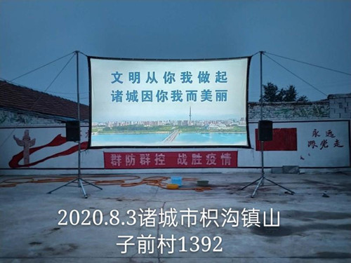 2020年,正值诸城市创建文明城市,市电影公司积极投身到争创全国文明城市的宣传工作中,在208个社区、1138个放映点,全面展开创建文明城市的宣传活动,助力文明城市建设。31支放映队的每个放映员都是文明城市的宣传员和代言人,每天通过村广播、车载喇叭、放映员小喇叭等方式满怀热情地活跃在田间地头,宣传公益电影和创建文明城市,跟村民热情互动共同录制宣传标语,映前现场讲解《文明指南》, 放映文明城市公益电影四千余场,为诸城市创建文明城市贡献了一份力量。