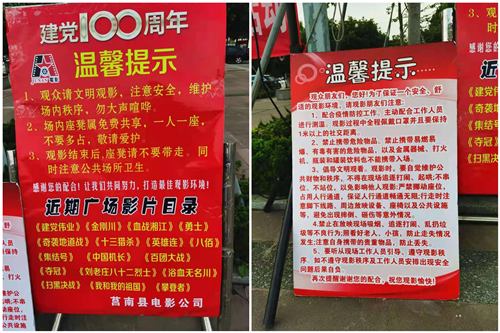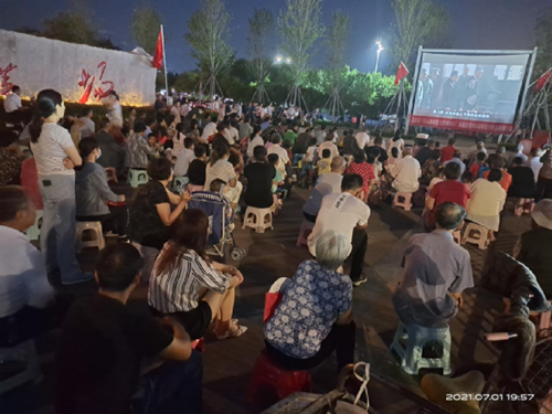当天,县电影公司为观众准备了国旗,电影开始前,观众们随着《没有共产党就没有新中国》的歌声自发地挥动起了手中的国旗。展映活动自7月1日持续至10月上旬,每晚在五洲广场进行放映,以“红心永向党 光影映初心”为主题,旨在通过一个个红色光影故事,回顾党的光辉历程,讴歌党的丰功伟绩,弘扬伟大的民族精神和时代精神,继承和发扬党的革命传统,激发人民群众的爱党爱国热情,引导党员干部群众从优秀红色电影作品中汲取昂扬向上的精神力量,立足本职、珍惜当下,不忘初心、牢记使命,砥砺前行,唱响礼赞中国共产党百年华诞、奋进新征程的昂扬旋律。