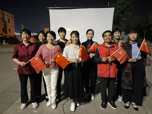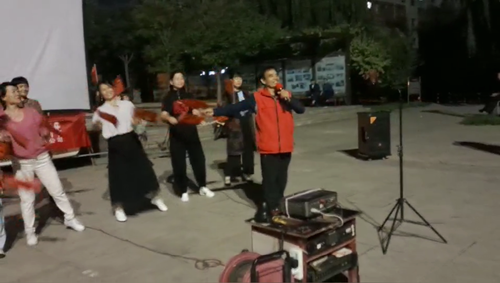 “我歌唱每一座高山,我歌唱每一条河……”,10月1日晚,在广饶县花官镇社区广场上,伴着银幕上的歌声和旋律,电影放映员来延志带领广场上的老少观众挥舞着五星红旗,还有社区平时跳广场舞的群众自发上台,带领大家载歌载舞,合唱《我和我的祖国》,表达着大家的爱国情怀。合唱后大家一起观看了电影《烈火金刚》。