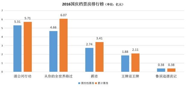 《从你的全世界路过》拿下国庆档前三天票冠军,此后让位于《湄公河行动》,最终以4.66亿的成绩拿下国庆档票房亚军。此前夺冠呼声最高的《爵迹》上映伊始便被《从你的全世界路过》压制,后又被《湄公河行动》“弯道超车”,最终只以2.74亿的成绩拿下国庆档票房季军。《王牌逗王牌》热度不高,以1.88亿的成绩屈居国庆档票房第四名。
