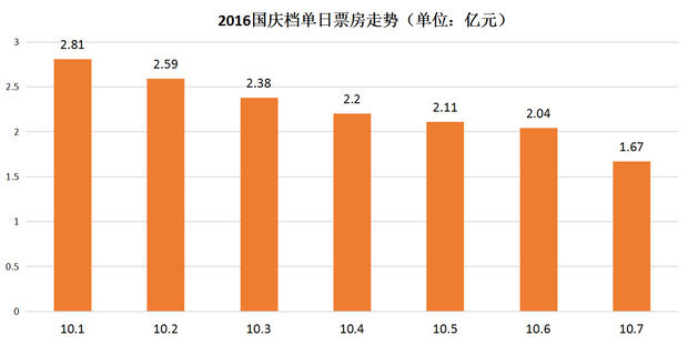国庆7天假期,单日票房呈递减之势,首日票房2.81亿,最后一日票房1.67亿,平均单日票房2.26亿。自《我不是潘金莲》改档11月后,《从你的全世界路过》、《湄公河行动》、《爵迹》、《王牌逗王牌》四部影片一直是公认的国庆档种子选手,事实证明,四部影片也确实联手统治了今年的国庆档——四部影片国庆档票房占比高达92.3%。这四部影片类型各异,命运也各不相同,其中《湄公河行动》凭借不错的口碑票房一路逆袭,由单日票房季军攀升至单日票房冠军,并最终夺得国庆档票房冠军,成为这个平庸档期的最大亮点。