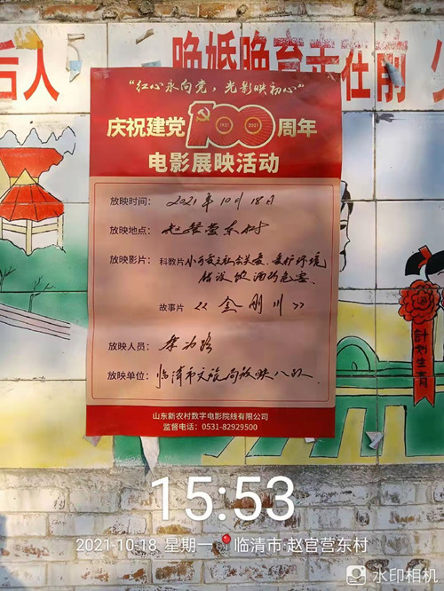 临清农村公益电影管理服务站贯彻落实中宣部电影数字节目管理中心“农村电影放映规范年”要求,加强农村公益电影放映管理、在标准化放映基础上不断提高放映服务质量,将放映公示作为农村电影放映服务的重要组成部分,促进农村电影公益放映工作规范化开展,满足广大农民群众不断提升的观影需求。活动开始前,公司安排专人负责制定放映计划,提前两天通过中宣部电影数字节目管理中心网站平台和当地党建微信群、各村微信群向广大群众公示放映的影片、时间、地点等详情。